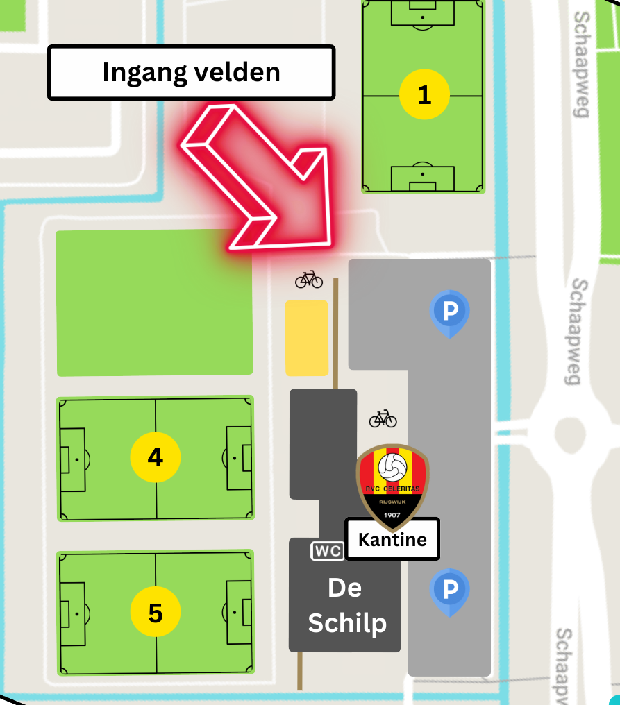 Op de plattegrond vindt u een overzicht van veldindeling en voorzieningen